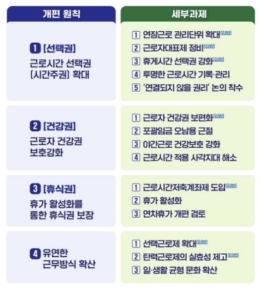 최근 윤석열 정부에서 추진하고 있는 근로시간 개편 방안에 대하여 다양한 목소리가 나오고 있습니다. 주 69시간 근무제 추진을 하였으나 여러 계층에 반발을 일으키며 대통령이 직접 소통 부족을 인정하며 현재 재검토 수순에 들어가고 있습니다.